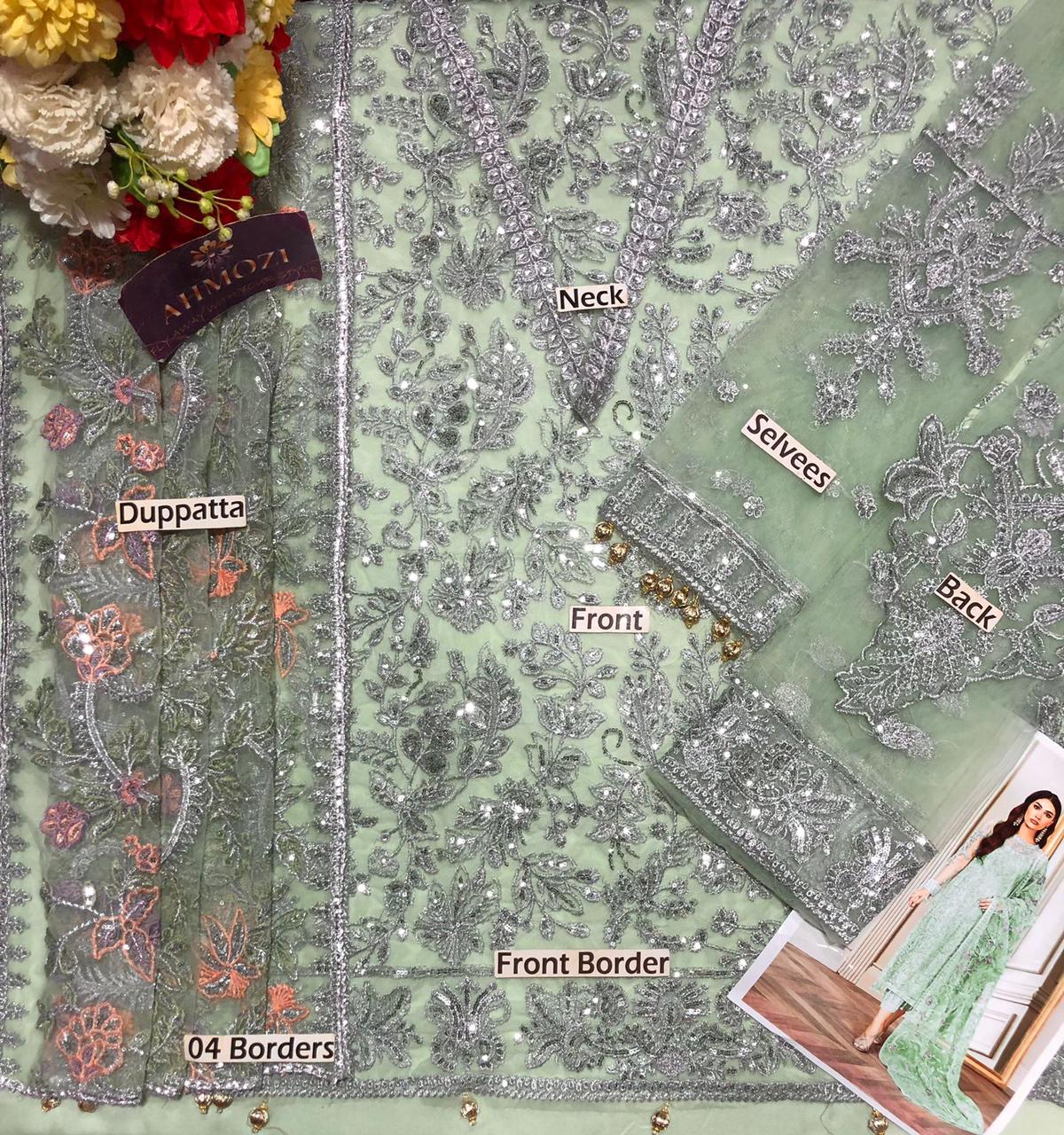 Step into elegance with the ZARIF Luxury Net Collection, featuring a complete designer net suit with inner included. This most-hit design showcases fully heavy spangle embroidery on the front, back, sleeves, and dupatta, enhanced with intricate cut-work borders, hanging zari, and stone tassels. Paired with a ready-to-wear dupatta, sharmoz silk trouser, and inner, this premium ensemble is perfect for weddings, formal events, and festive occasions. A true statement of luxury and craftsmanship.